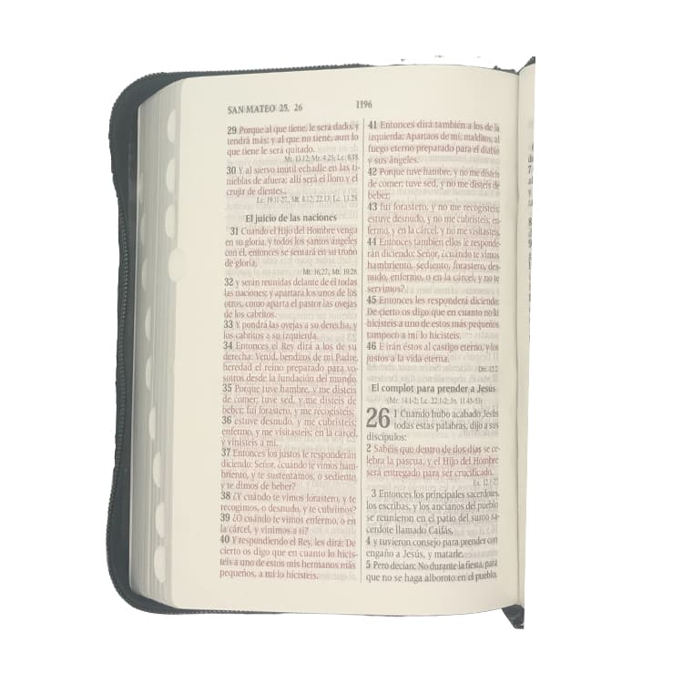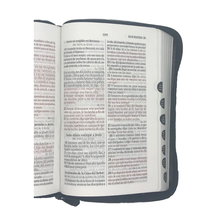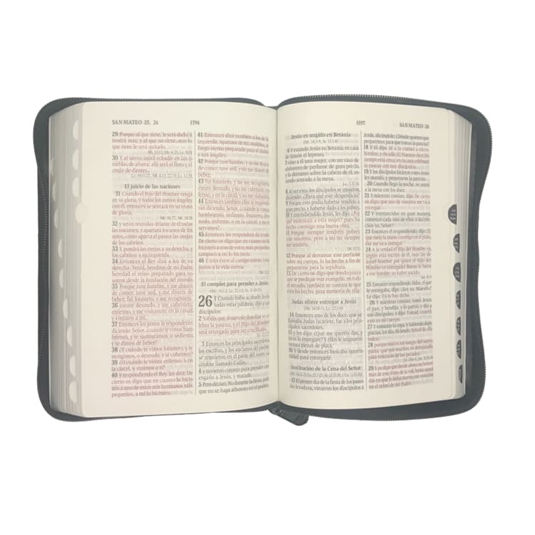 Biblia en un tamaño ideal para llevar incluye las palabras de Jesus en rojo, con indice para encontrar fácil los libros de la Biblia y con cierre para protección de la misma